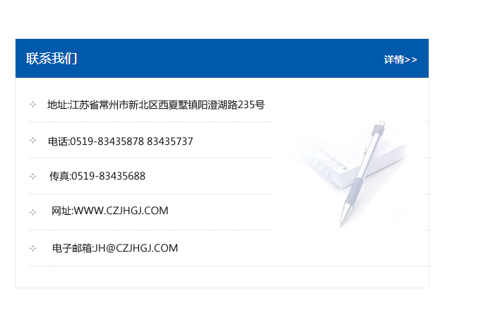 傳真:0519-83435688    郵編:213135    網址:WWW.czjhgj_com.ourtty.com    電子郵箱:JH@czjhgj_com.ourtty.com